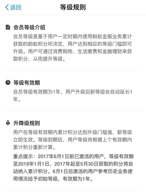 支付寶會(huì)員大致規(guī)則:計(jì)算周期為用戶近1年的行為數(shù)據(jù),會(huì)員身份的有效期為一年,有效期內(nèi)升級(jí)立即生效并且新等級(jí)有效期自動(dòng)延長一年,到有效期時(shí)若成長值不足以達(dá)到當(dāng)前等級(jí)將會(huì)被降級(jí)。