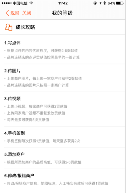 而大眾點(diǎn)評(píng)則更加注重用戶參與平臺(tái)的寫點(diǎn)評(píng)、傳圖片、傳視頻等互動(dòng)行為,因此成長值來源主要來源于平臺(tái)活躍。