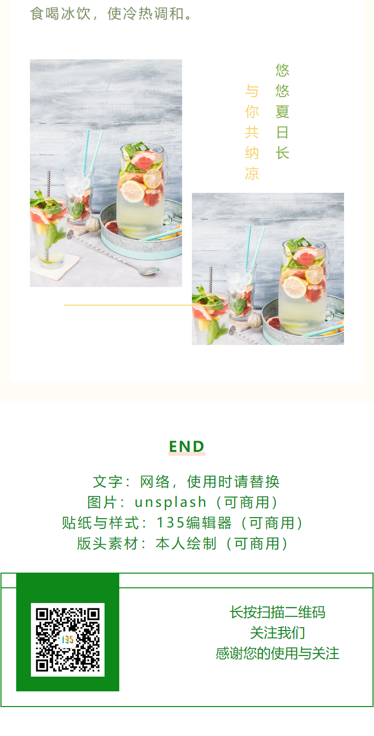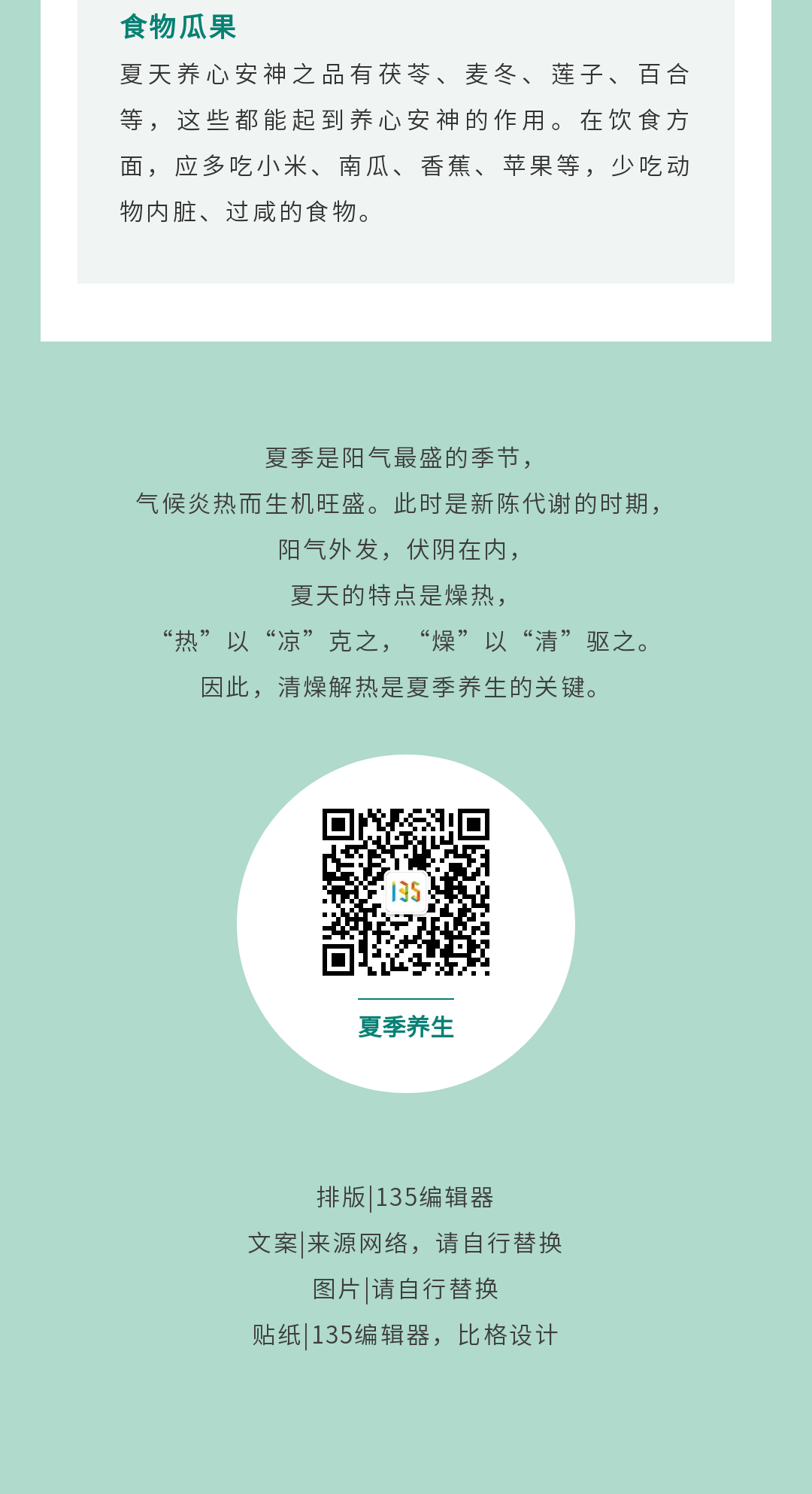 ? 三伏天養(yǎng)生科普類的推文在色彩上面可以選用一些偏清新風(fēng)格的顏色,視覺上能給人帶來一種清爽的感覺。像綠色、藍(lán)色等