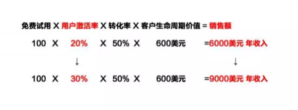 如果你將激活率從 20% 提高到 30%,而從激活到客戶的轉(zhuǎn)化率保持不變,則 100 個(gè)免費(fèi)試用用戶會(huì)轉(zhuǎn)化為 15 個(gè)付費(fèi)客戶。