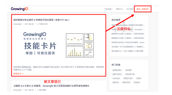 以 GrowingIO 的博客為例。某 PM 訪問了該網(wǎng)站,瀏覽了博客上的文章,對產(chǎn)品系列的文章非常產(chǎn)生濃厚的興趣,此時(shí)用戶就被激活。接下來就是用戶注冊的轉(zhuǎn)化環(huán)節(jié)。