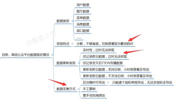 上圖是對(duì)目前微信后臺(tái)數(shù)據(jù)現(xiàn)狀的概要,使得運(yùn)營(yíng)人員在數(shù)據(jù)查看及采集上有以下的痛點(diǎn):