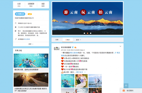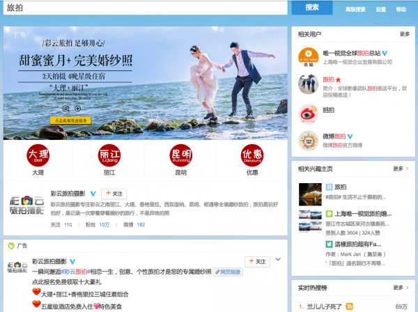 勾搭同行的粉絲。那些關(guān)注了其他攝影、旅拍或攝影師相關(guān)微博的用戶,有相關(guān)需求的可能性也是不少了,可以挑相對(duì)真實(shí)活躍且地域范圍合適的,地毯式禮貌勾搭。粉絲中若發(fā)現(xiàn)一些非同行的企業(yè)級(jí)商戶,若有合作可能,也可以主動(dòng)聯(lián)系。