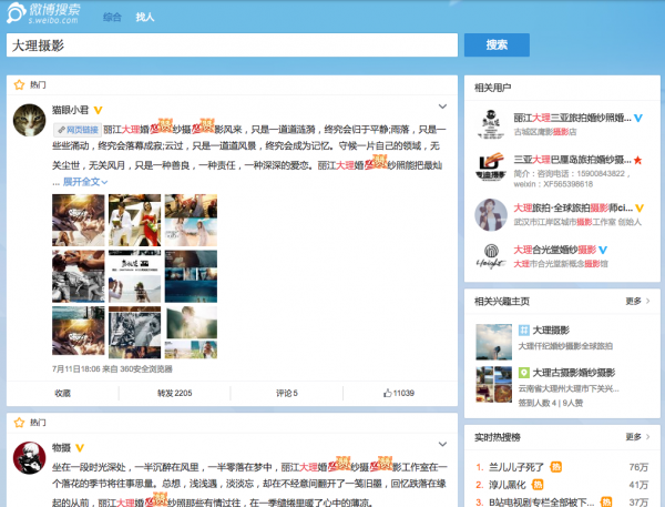 因?yàn)檫@些信息在用戶搜索關(guān)鍵字時(shí),真的占了很大的比重,你可以試試,在搜索“攝影”或者“旅拍”,“大理攝影”之類的關(guān)鍵字時(shí),是不是,名字、微博內(nèi)容、文章、話題主頁這幾大模塊中有相關(guān)關(guān)鍵字的內(nèi)容,就成了流量的主要入口?
