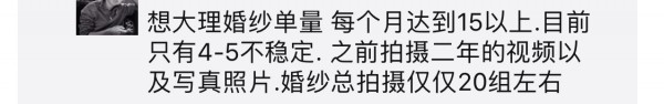 具體問題:希望工作室大理的婚紗單量每個(gè)月達(dá)到15以上。目前只有4-5不穩(wěn)定。之前拍攝了兩年的視頻以及寫真照片,但婚紗總拍攝僅僅20組左右。