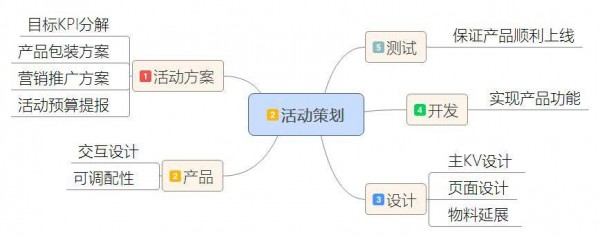 基于活動準備期的設(shè)定,將會進一步進行活動策劃來達成目標。這里的活動策劃是一個廣泛的定義,共包含5個部分:活動方案、產(chǎn)品、設(shè)計、開發(fā)、測試。把活動從策劃到產(chǎn)品頁面上線均包含在內(nèi),是因為產(chǎn)品頁面設(shè)計開發(fā)過程中,策劃的工作也一直持續(xù)進行中,大到整體頁面風(fēng)格的確認,小到某個交互體驗或某個頁面文描的更改。