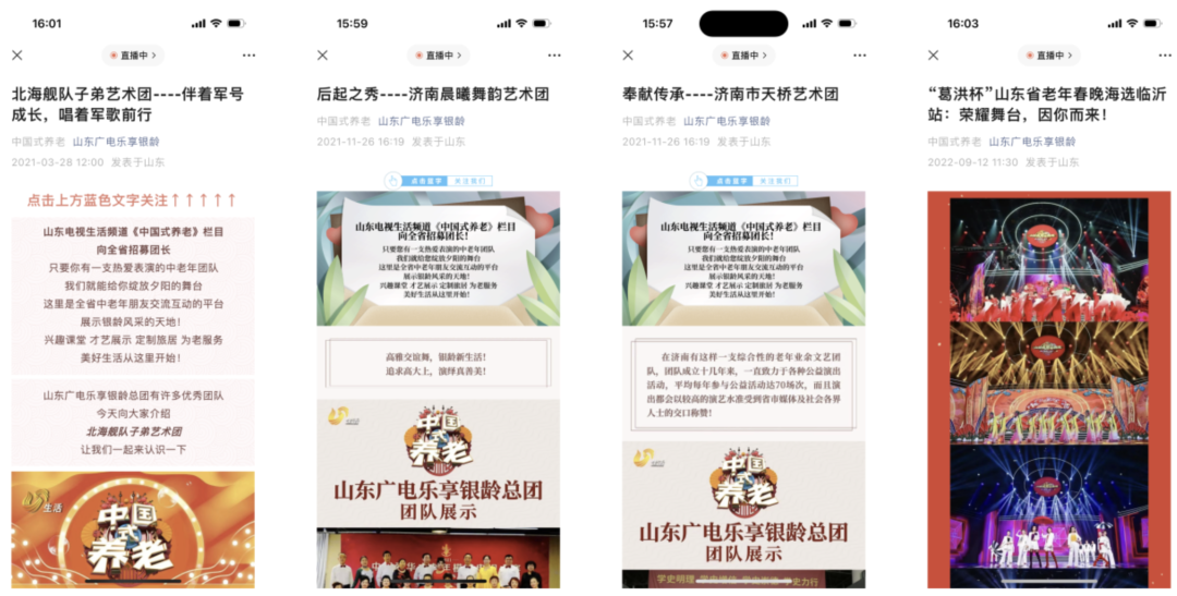 時(shí)尚銀齡文藝活動(dòng)展示:作為一個(gè)提供享老服務(wù)的官方平臺(tái),山東各地的中老年文藝團(tuán)體,都有機(jī)會(huì)出鏡展示各自才藝,而這部分群體也成為了直播間里的忠實(shí)用戶。