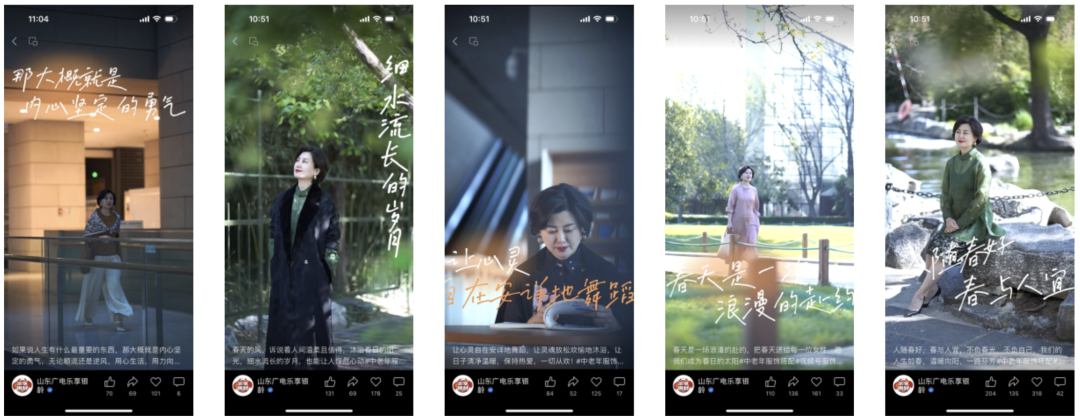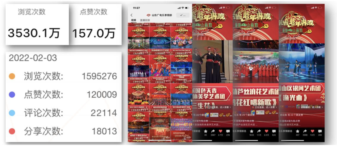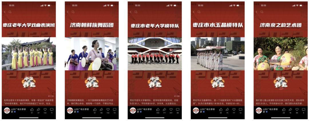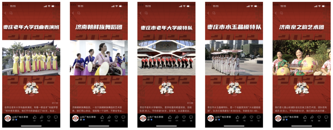 除此之外,還有山東老年春晚節(jié)目展演等視頻內(nèi)容。充分發(fā)揮了官方平臺(tái)的號(hào)召力,加之視頻制作優(yōu)勢(shì)帶領(lǐng)山東中老年文藝團(tuán)體大屏、小屏美好生活展示。