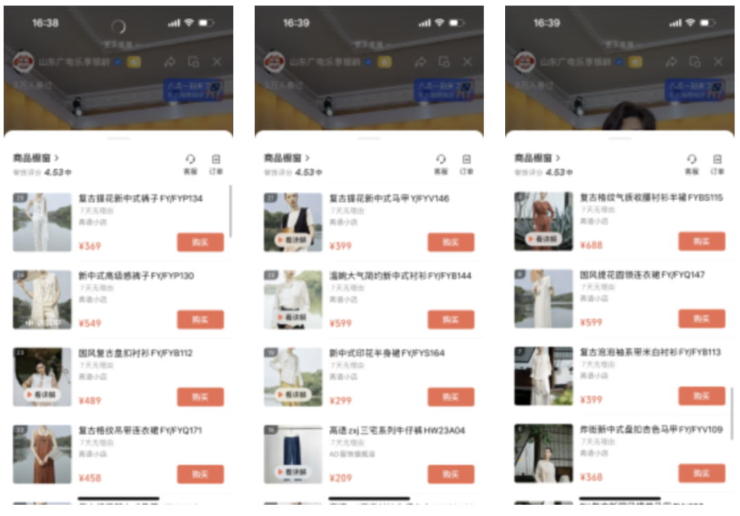 貨品類別:根據(jù)每場(chǎng)直播主題不同,購物袋所掛商品也有差異,以新中式場(chǎng)為例,多為褲子、襯衫、馬甲、連衣裙等日常百搭品。