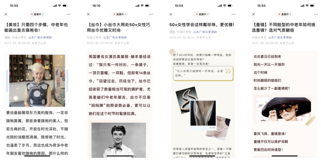 2021年,為了更好地滿足中老年群體對(duì)于審美和社交的需求,山東廣電樂享銀齡以微信公眾號(hào)和視頻號(hào)為載體,將中老年群體的社交場(chǎng)景從線下延伸到了線上。線下活動(dòng)受限于場(chǎng)景和許多客觀因素,而在直播間,姐姐阿姨們不僅可以學(xué)到很多時(shí)尚美妝類的知識(shí),也能夠通過朋友圈的轉(zhuǎn)發(fā),將正能量的生活方式,對(duì)美的追求,傳遞給更多的人。
