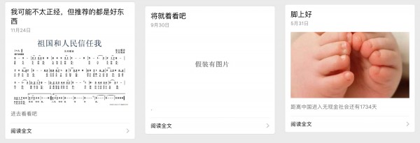 3. 標題、配圖開啟朋友圈模式,內容又如何呢?左圖中,全文4個字,沒有任何企業(yè)相關信息,純屬個人吐槽,像這樣的推文還不止一篇;另外,如后兩張所示,支付寶官方公眾號推文還具有特別顯著的特點:字數(shù)極少(經常是幾句話)、排版隨性(有時干脆不排版)。