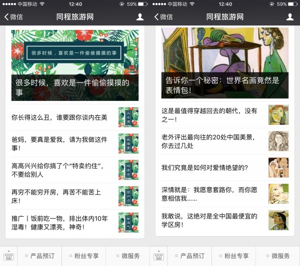 像本文前面提到的,硬廣從標題到文風都是很官方的,缺乏互動性,屬單方面的信息發(fā)布,粉絲很難提起興趣,容易審美疲勞。同樣在打廣告,同程旅游網的服務號可能是整個旅游界最會玩的了。