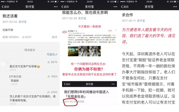 支付寶企業(yè)微信公眾號部分內容截圖