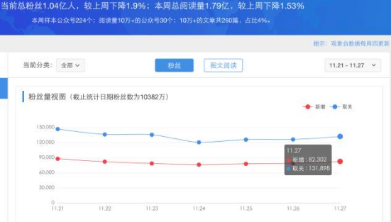 目前公眾號的平均凈增粉絲量(新增關(guān)注人數(shù)-取消關(guān)注人數(shù))為 30000 人左右
