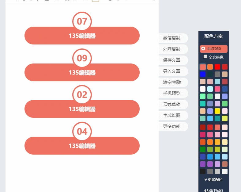 作為135編輯器最核心,最牛逼,最方便的功能,秒刷共,絕對(duì)是你選擇135編輯器的不二理由,所見即所得,一鍵秒刷,不必手動(dòng)修改粘貼,免去復(fù)制麻煩,也減少錯(cuò)誤率,同時(shí)還保留了機(jī)動(dòng)性,無論是粘貼移動(dòng)還是保存換色都可以一鍵操作。