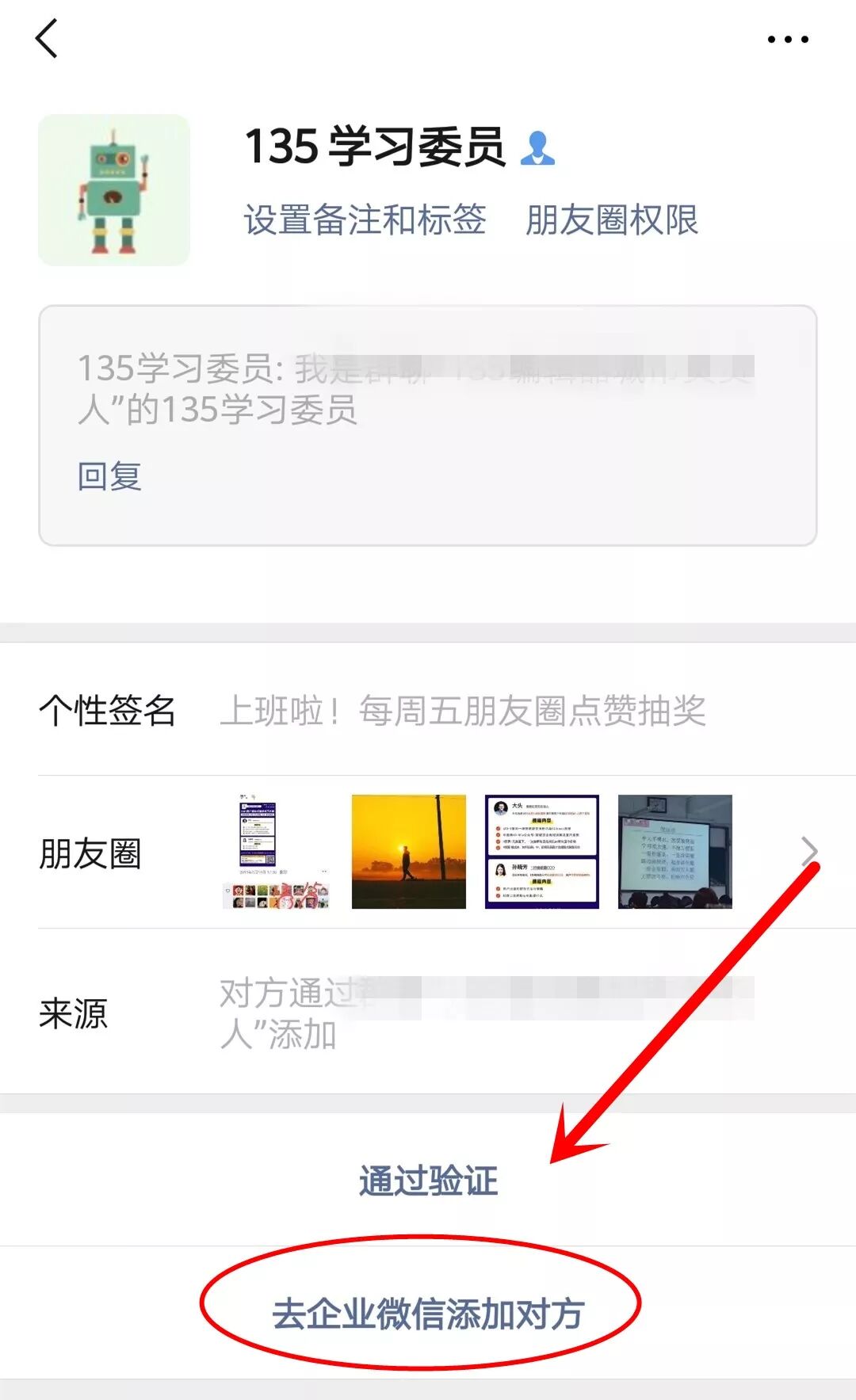 首先學(xué)習(xí)委員直接添加三兒的微信,我們在打開好友驗(yàn)證的頁面,多了一個(gè)“去企業(yè)微信添加對方”的按鈕。