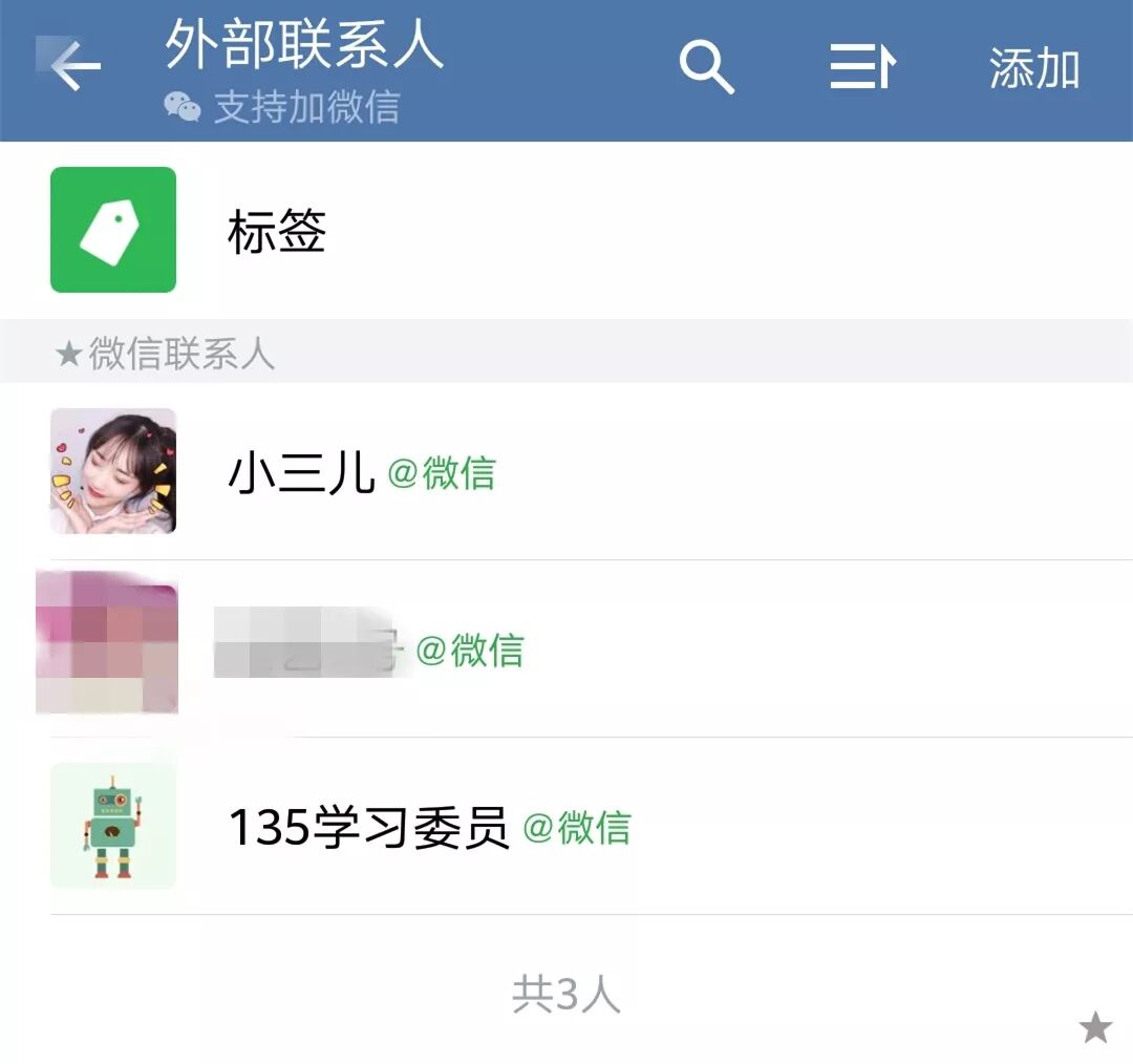 三兒把學(xué)習(xí)委員添加到了企業(yè)微信好友,然后在企業(yè)微信通訊錄界面,最頂部有一個(gè)專門的微信好友即外部聯(lián)系人按鈕。