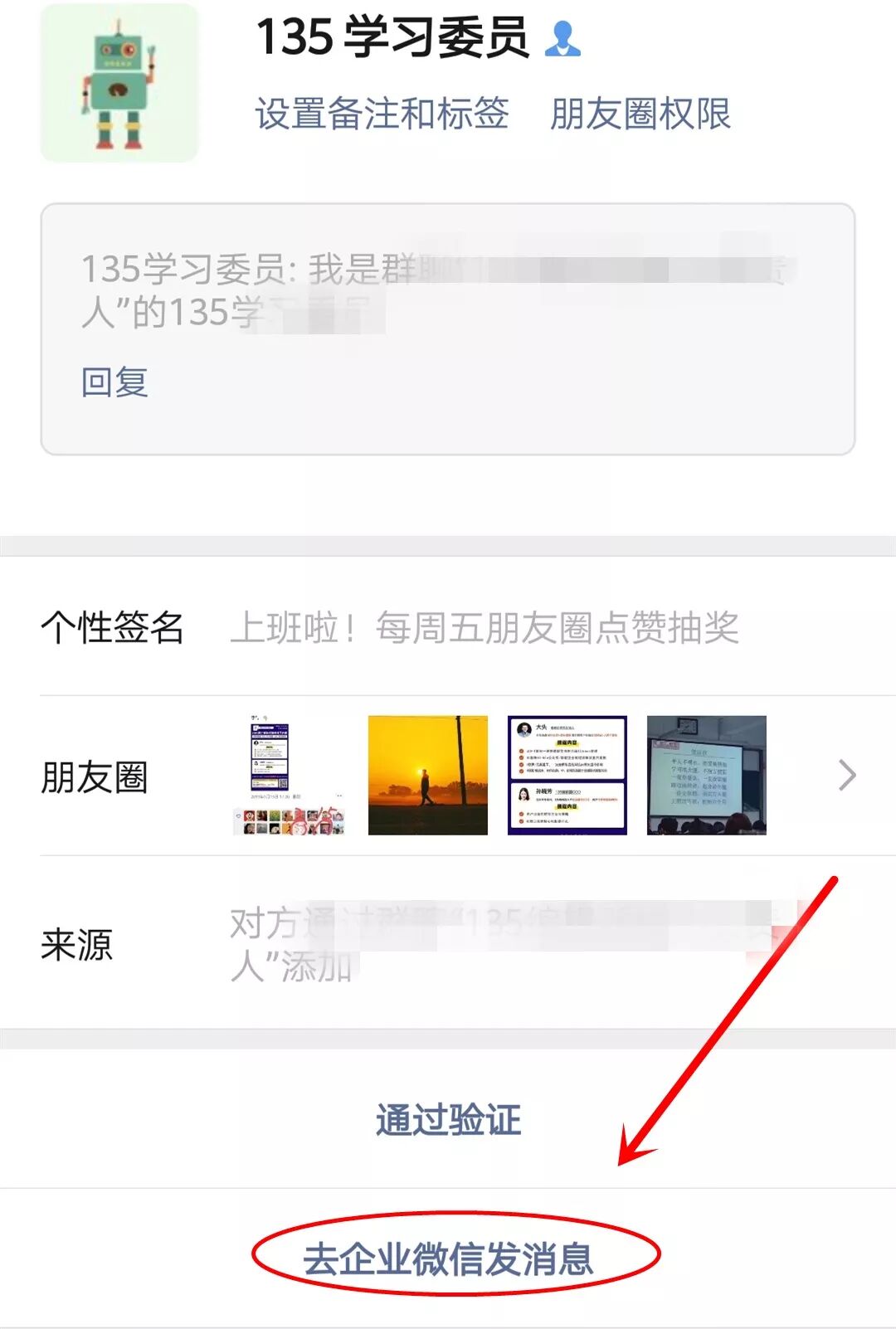 最后,我們再回到微信上,打開剛剛的聯(lián)系人驗(yàn)證界面,直接顯示的是“去企業(yè)微信發(fā)消息”。