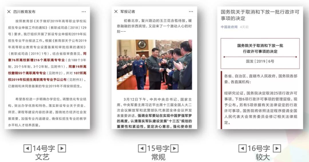 當(dāng)然這也不是絕對(duì)的,現(xiàn)在公眾號(hào)的字體正在趨于較小方向發(fā)展,有的公眾號(hào)甚至開始使用12號(hào)字體。由于政務(wù)類文章文字較多,因此15號(hào)最為合適,這樣不會(huì)讓文章過長(zhǎng),也能照顧到大齡受眾的體驗(yàn)。