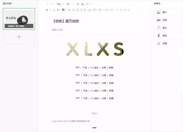 建議大家在后臺制作一套或者兩套自己使用的微信排版模板,比如固定的頂部圖,文字,底部引導(dǎo)關(guān)注的圖片文字等,這樣的好處是每次編輯新的圖文的時候可以非常方便的調(diào)用,而且所有微信都是保持統(tǒng)一的風(fēng)格,最重要的是這樣排版速度超級快。