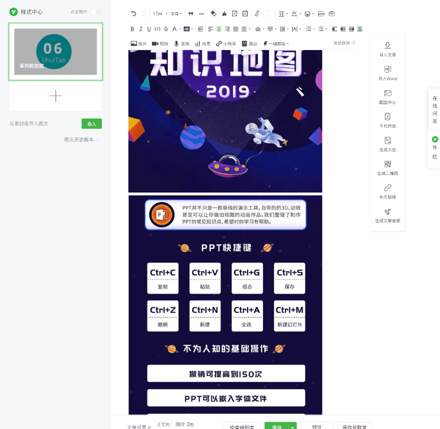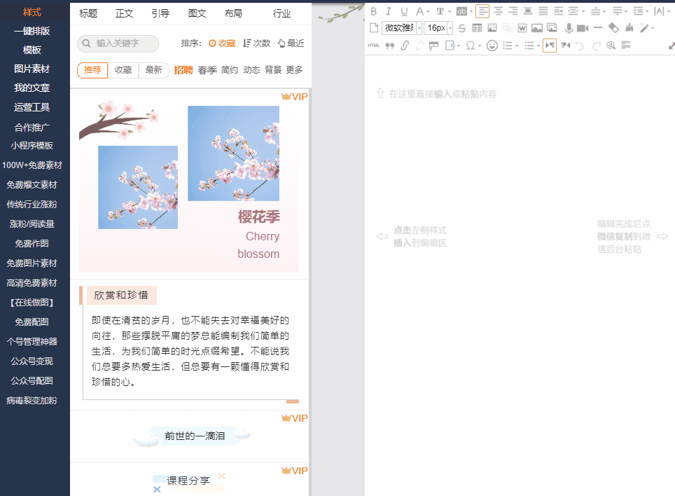 輯在第三方平臺(tái)編輯完成后,我們只需要將編輯好的樣式復(fù)制粘貼到公眾號(hào)后臺(tái)即可,如果你將公眾號(hào)綁定在了第三方編輯器,就可以直接同步,但如果沒(méi)有,通過(guò)簡(jiǎn)單的Ctrl + C/V ,也不會(huì)特別麻煩。