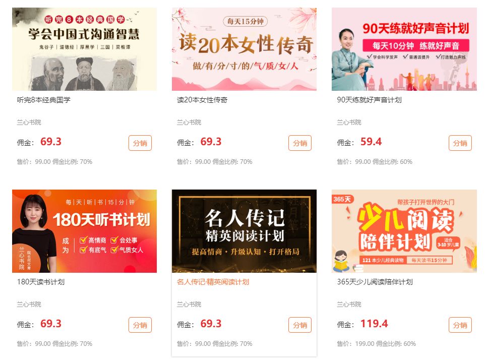 135分銷平臺為大家新推出“聽書”類分銷產(chǎn)品,此類產(chǎn)品與以往課程有所不同,它是一個(gè)周期性的伴隨式讀書計(jì)劃,分銷賣點(diǎn)更為突出。