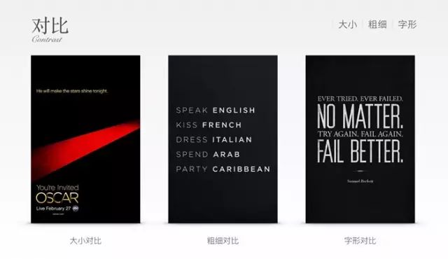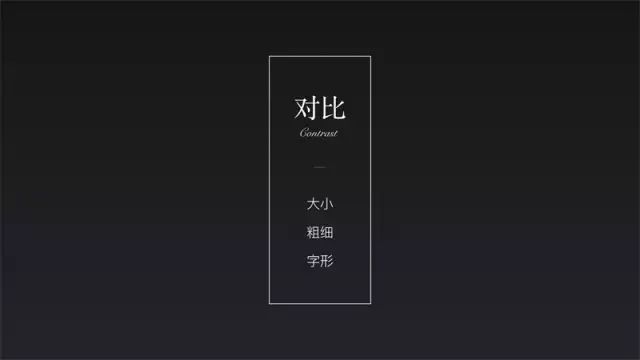 字形對比:相對以上兩種更加自由多樣,最普通的為襯線體與非襯線體的對比,甚至還可以進行字體設計,加入圖形元素等。