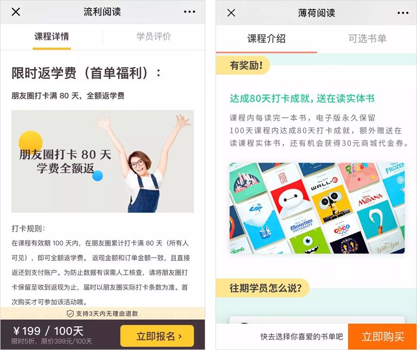 目前這類產(chǎn)品的利益誘導(dǎo)主要有兩種模式,一種是以流利閱讀為代表的“堅持打卡返學(xué)費”模式,一種是以薄荷閱讀為代表的“堅持打卡送優(yōu)惠券”模式。