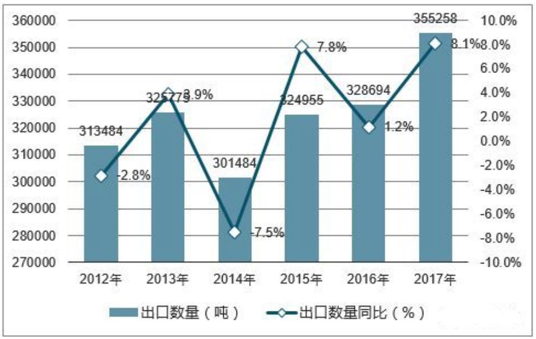 再看中國(guó)海關(guān)的數(shù)據(jù):2017年同年出口量是35.5萬噸。也就是每年基本上15%左右的產(chǎn)量是出口的。其他是內(nèi)銷。