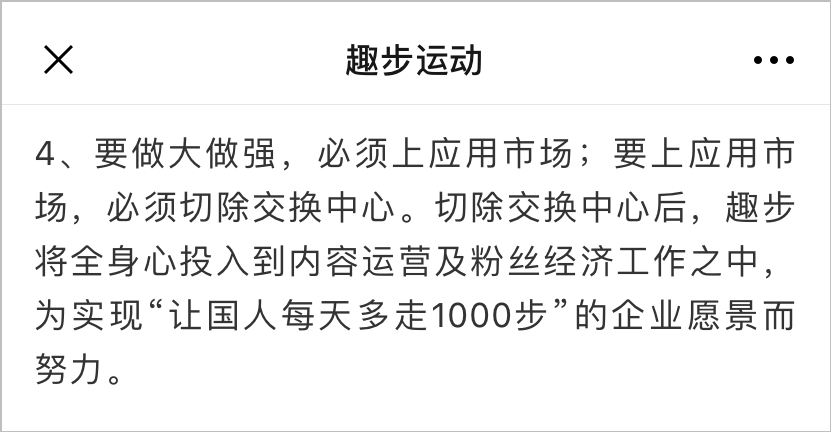 這樣的 App,說(shuō)白了就是靠拉人頭換錢啊。到底是怎么在 App Store 上架的?趣步的后臺(tái)這么硬的嗎?這個(gè)問(wèn)題終于在趣步的官方公眾號(hào)找到了答案。為了在 App Store 上架,他們把平臺(tái)原有的“交換中心”取消了。