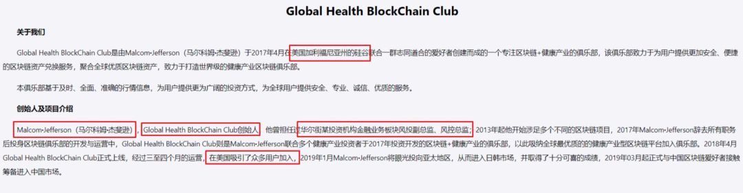 這個(gè) GHT(Global Health BlockChain Club)于 2017 年在美國(guó)硅谷創(chuàng)建,創(chuàng)始人是由華爾街某投資機(jī)構(gòu)副總監(jiān) Malcom·Jefferson 。