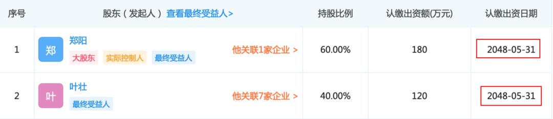 這家公司的 2 個(gè)大股東雖然認(rèn)繳出資額分配得很好,但是認(rèn)繳出資日期已經(jīng)安排到了 2048 年……