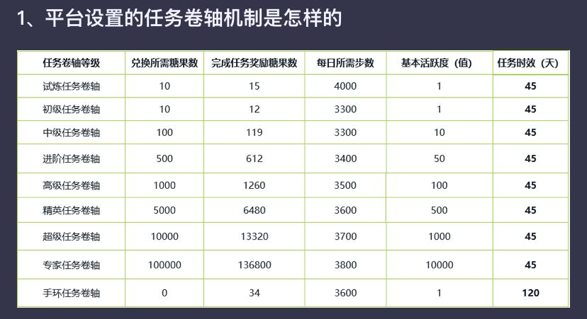 10 枚糖果可以兌換一個(gè)初級(jí)卷軸任務(wù),在任務(wù)有效期內(nèi),只要我每天走了 3300 步,平臺(tái)就會(huì)給我發(fā)放 12 枚糖果,并加 1 點(diǎn)活躍度。