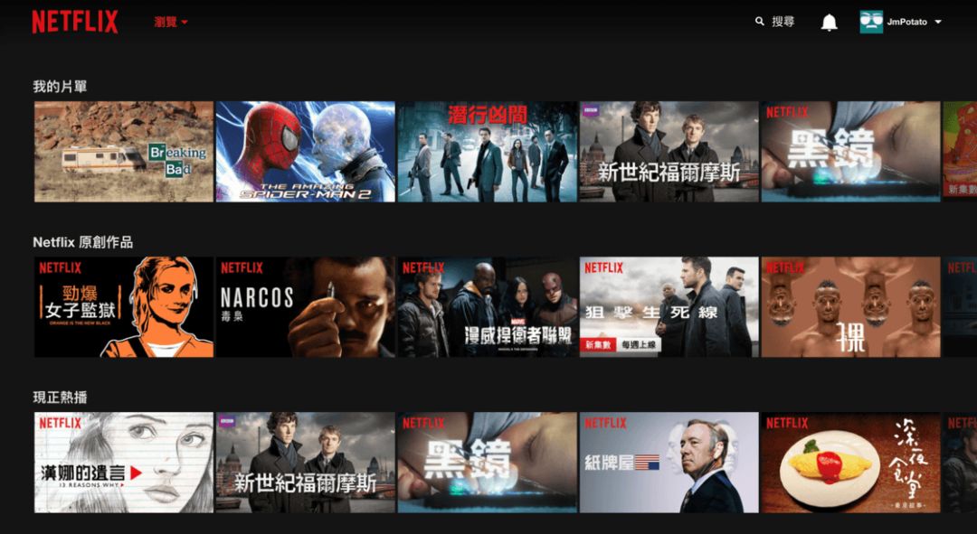 在一切設置完成后,我們進入到了 Netflix 的主頁面。在這個界面,呈現(xiàn)的都是和你一開始注冊后選擇影片類似的片子,讓你在第一時間內感受到平臺的價值。