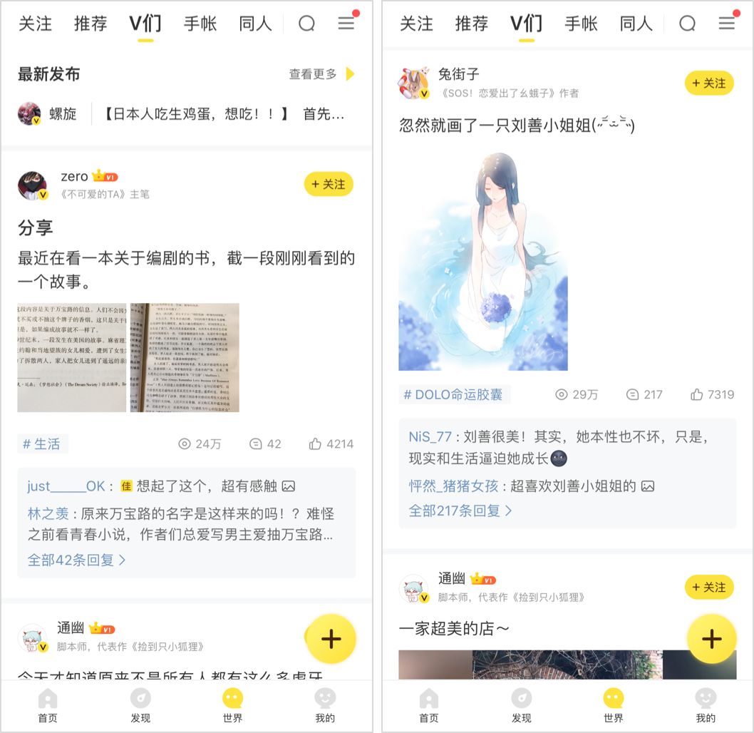 快看漫畫(huà) App 有一個(gè)社區(qū)叫做“世界”,相當(dāng)于是漫畫(huà)垂直領(lǐng)域的微博。其中有一個(gè)分類(lèi)是"V 們",也就是漫畫(huà)作者發(fā)布的內(nèi)容。