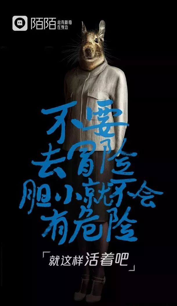 然后是陌陌《就這樣活著吧》系列海報(bào),以正話反說(shuō)的形式,用5種動(dòng)物隱射出阻止人們逃離平淡生活、去遇見(jiàn)新奇的五大因素,引起年輕人群的共鳴:
